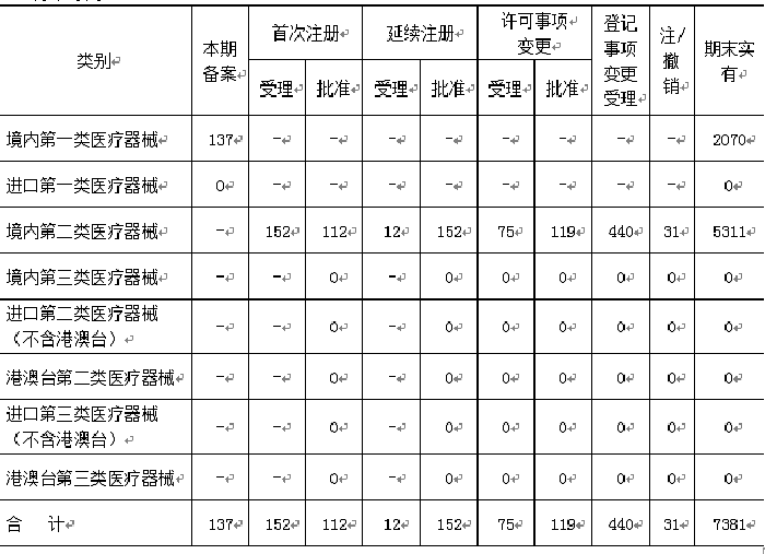 2018年上半年,全市境内第一类医疗器械共备案137件;境内第二类医疗器械首次注册受理152件、批准112件,延续注册受理12件、批准152件,许可事项变更受理75件、批准119件,登记事项变更受理440件,注/撤销31件。截至2018年5月底,本市境内第一类医疗器械备案2070件,境内第二类医疗器械注册证5311件。
